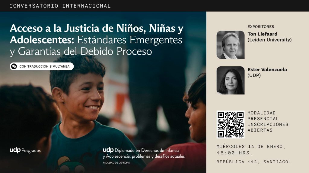 En el marco del Diplomado en Derechos de Infancia y Adolescencia: problemas y desafíos actuales de la Facultad de Derecho UDP, se desarrollará el Conversatorio Internacional titulado “Acceso a la Justicia de Niños, Niñas y Adolescentes: Estándares Emergentes y Garantías del Debido Proceso”, en el que participan: