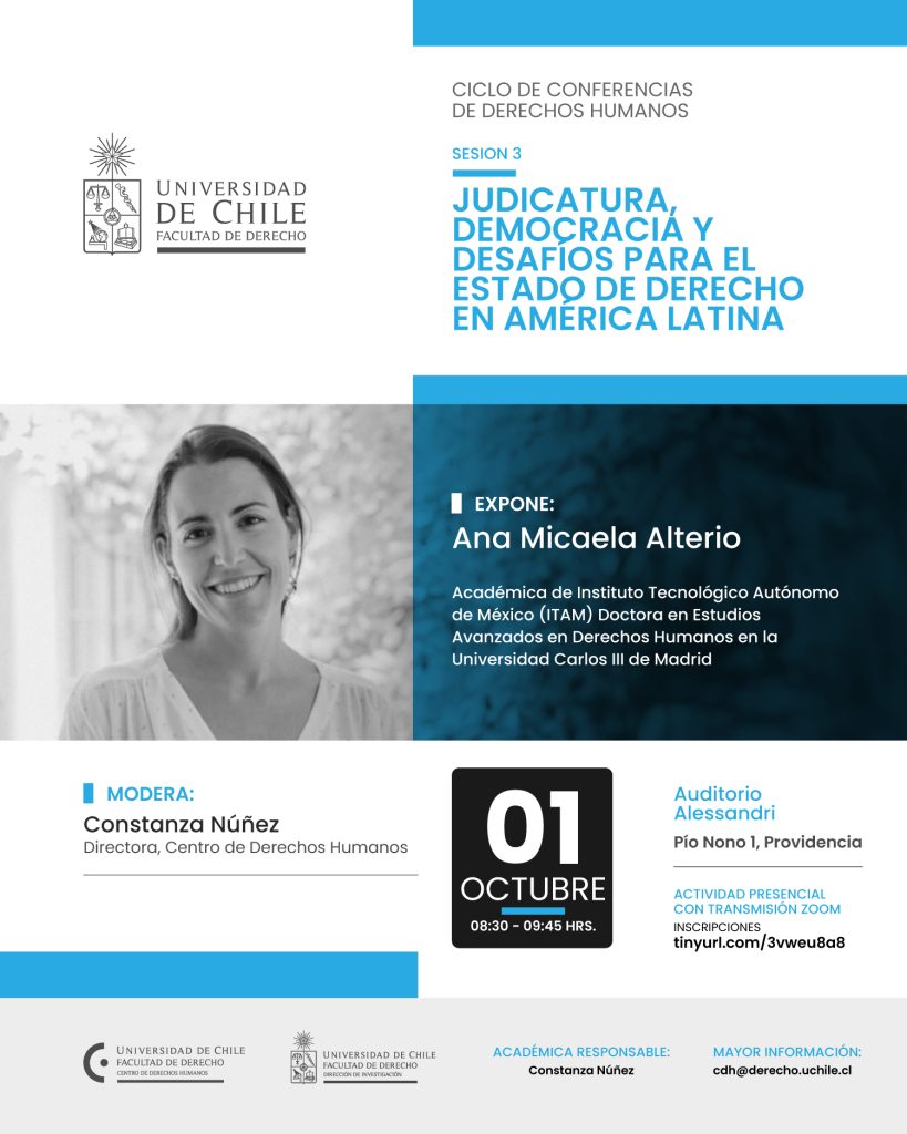 La Facultad de Derecho de la Universidad de Chile organiza el ciclo de conferencias de Derechos Humanos, Sesión 3: “Judicatura, Democracia Y Desafíos Para El Estado De Derecho En América Latina” en el cual expondrá Ana Micaela Alterio y modera Constanza Núñez.