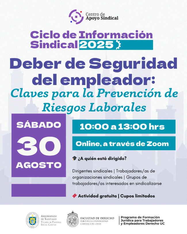 El Arzobispado de Santiago, Vicaría de Pastoral Social Caritas y la Facultad de Derecho de la Pontificia Universidad Católica de Chile organizan el Ciclo de Información Sindical 2025.  “Deber de Seguridad del empleador: Claves para la Prevención de Riesgos Laborales” el cual está dirigido a Trabajadores/as de organizaciones sindicales | Dirigentes sindicales | Grupos de trabajadores/as interesados en sindicalizarse.