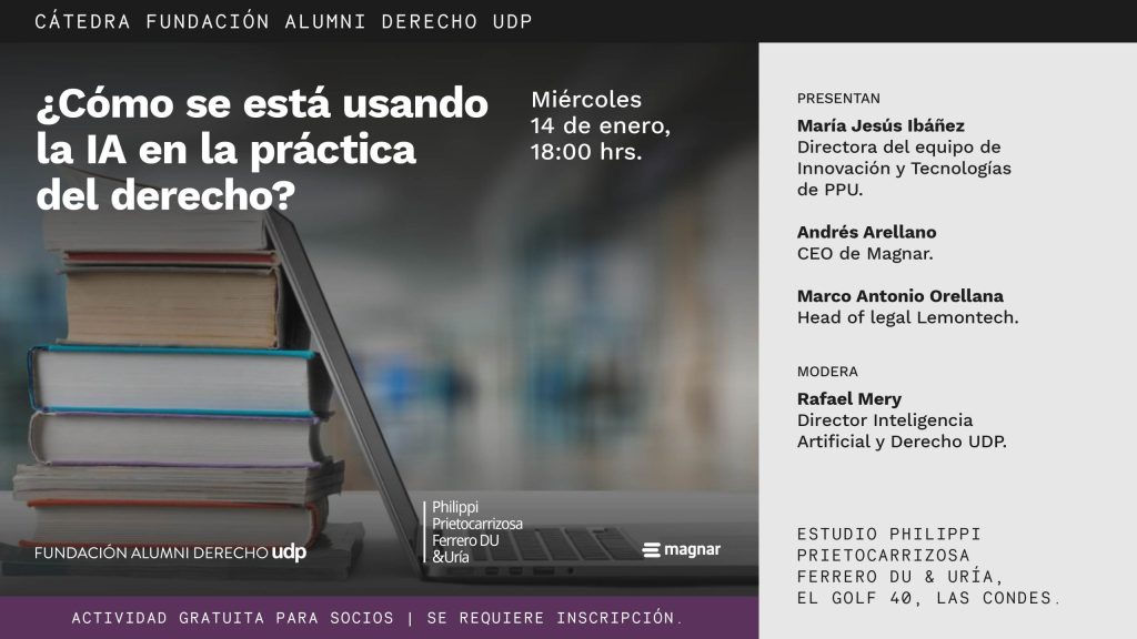 En el marco de la Cátedra Fundación Alumni Derecho UDP, se desarrollará la actividad “¿Cómo se está usando la IA en la práctica del derecho?”, instancia organizada por la Fundación Alumni Derecho UDP, con la participación de: