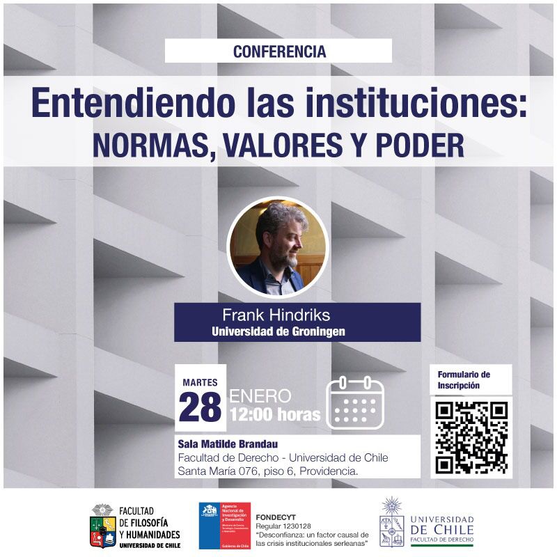 La Facultad de Derecho y la Facultad de Filosofía de la Universidad de Chile organizan la Conferencia “Entendiendo las instituciones: normas, valores y poder”, la que cuenta con la participación de Frank Hindriks de la Universidad Groningen. El evento se llevará a cabo el martes 28 de enero desde las 12:00 horas en la Sala Matilde Brandau en la Facultad de Derecho de la Universidad de Chile, en Avenida Santa María 076, piso 6, Providencia.