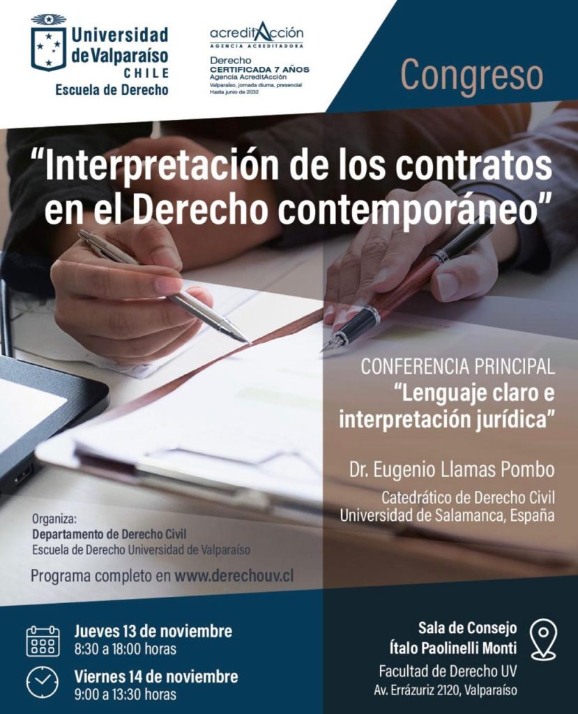 La Escuela de Derecho de la Universidad de Valparaíso, a través de su Departamento de Derecho Civil, organiza el congreso titulado “Interpretación de los contratos en el Derecho contemporáneo”. La conferencia principal estará a cargo del Dr. Eugenio Llamas Pombo, catedrático de Derecho Civil de la Universidad de Salamanca, España, quien dictará la ponencia “Lenguaje claro e interpretación jurídica”.