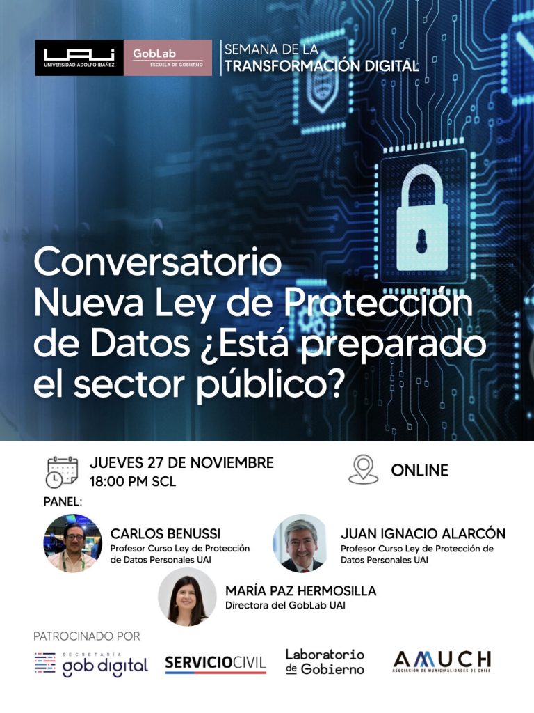 En el marco de la Semana de la Transformación Digital, GobLab de la Universidad Adolfo Ibáñez (UAI) organiza el conversatorio “Nueva Ley de Protección de Datos: ¿Está preparado el sector público?”, que abordará los desafíos institucionales y operativos que implica la implementación del nuevo marco normativo en organismos estatales.