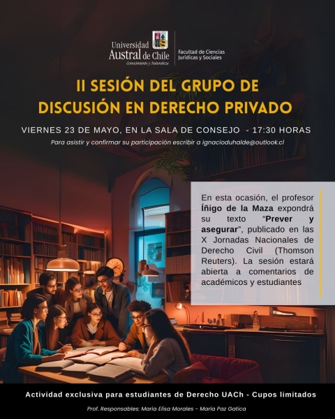 La Facultad de Ciencias Jurídicas y Sociales de la Universidad Austral de Chile organiza la II Sesión del grupo de discusión en Derecho Privado, en esta ocasión, el profesor Iñigo de la Maza expondrá su texto “Prever y asegurar”, publicado en las X Jornadas Nacionales de Derecho Civil (Thomson Reuters). La sesión estará abierta a comentarios de académicos y estudiantes.