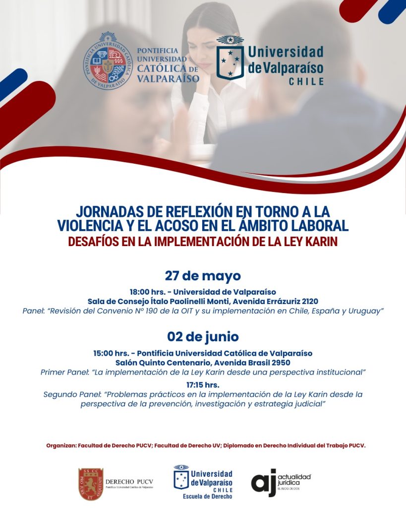 La Pontificia Universidad Católica de Valparaíso, en conjunto con la Universidad de Valparaíso y Actualidad Jurídica, invita a participar en las Jornadas de reflexión sobre violencia y acoso en el ámbito laboral: desafíos en la implementación de la Ley Karin.