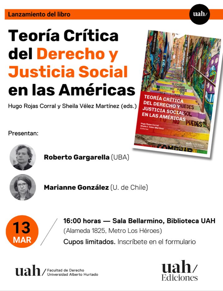 La Facultad de Derecho de la Universidad Alberto Hurtado organiza el Lanzamiento del libro “Teoría Crítica del Derecho del Derecho y Justicia Social en las Américas” de Hugo Rojas Corral y Sheila Vélez Martínez (eds.). La actividad será presentada por Roberto Gargarella (UBA) y Marianne González (U. de Chile).