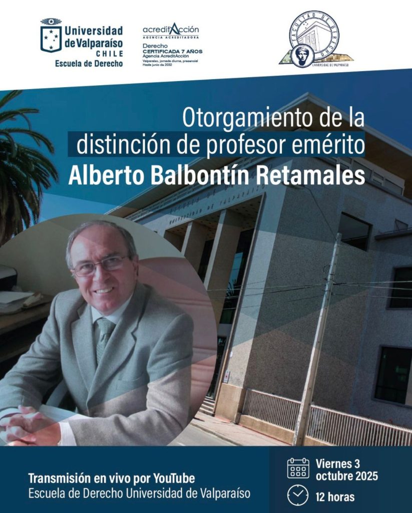 La Escuela de Derecho de la Universidad de Valparaíso organiza el Otorgamiento de la distinción de profesor emérito a Alberto Balbontín Retamales, lo cual será transmitido en vivo por YouTube.