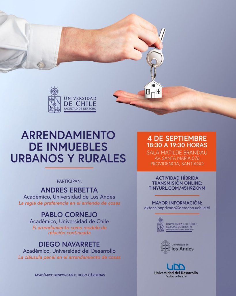 La Facultad de Derecho de la Universidad De Chile, Universidad de los Andes y la Facultad de Derecho de la Universidad del Desarrollo organizan el Seminario sobre “Arrendamiento de inmuebles urbanos y rurales” en el cual participan Andrés Erbetta que aborda “La regla de preferencia en el arriendo de cosas”; Pablo Cornejo quien expone sobre “El arrendamiento como modelo de relación continuada” y Diego Navarrete sobre “La cláusula penal en el arrendamiento de cosas”.