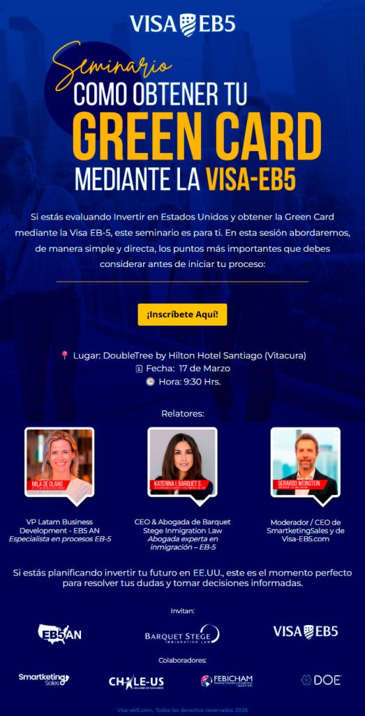 Las inscripciones se encuentran disponibles AQUÍ: https://pages.services/visa-eb5.com/camino-a-la-green-card/?ts=1768508655651 El evento se llevará a cabo el lunes 17 de marzo, entre las 9:30 y las 11:30 horas, de forma presencial en el hotel DoubleTree by Hilton Santiago, ubicado en Avenida Vitacura 2727, Las Condes
