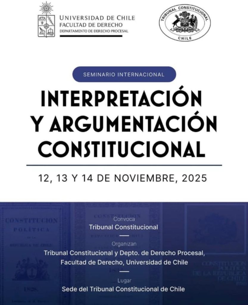 El Tribunal Constitucional y la Facultad de Derecho del Departamento de Derecho Procesal convocan al Seminario Internacional “Interpretación Y Argumentación Constitucional”, el cual se realizará el 12, 13 y 14 de noviembre del 2025 en la Sede del Tribunal Constitucional de Chile