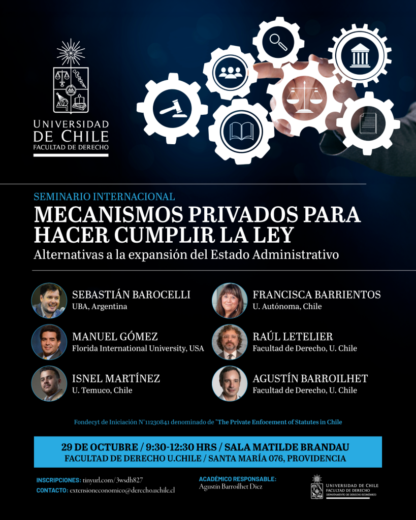 La Facultad de Derecho de la Universidad de Chile organiza el seminario internacional “Mecanismos privados para hacer cumplir la ley: alternativas a la expansión del Estado Administrativo”, en el marco del proyecto Fondecyt de Iniciación N° 11230841 titulado “The Private Enforcement of Statutes in Chile”.