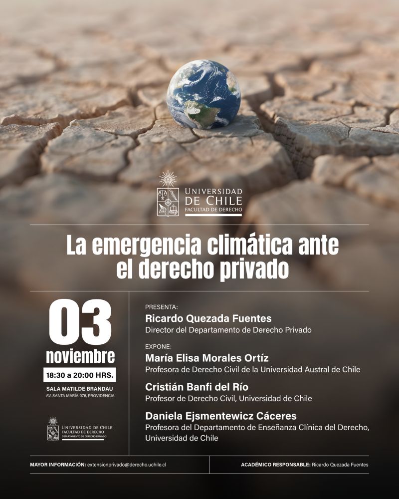 La Facultad de Derecho de la Universidad de Chile, a través del Departamento de Derecho Privado, organiza el seminario “La emergencia climática ante el derecho privado”, en el que se analizarán los desafíos y respuestas jurídicas del derecho civil frente al cambio climático.