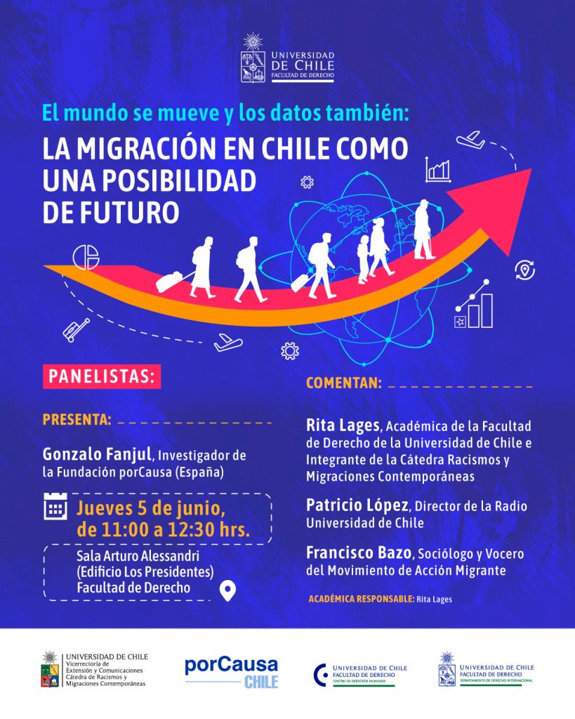 La Facultad de Derecho de la Universidad de Chile, Vicerrectoría de Extensión y Comunicaciones Catedra de Racismos y Migraciones Contemporáneas, porCausa Chile, Centro de Derechos Humanos y el Departamento de Derecho Internacional organizan el Seminario «La migración en Chile como una posibilidad de futuro», la cual será presentada por Gonzalo Fanjul, Investigador de la Fundación porCausa (España) y comentada por Rita Lages, Patricio López, y Francisco Bazo.