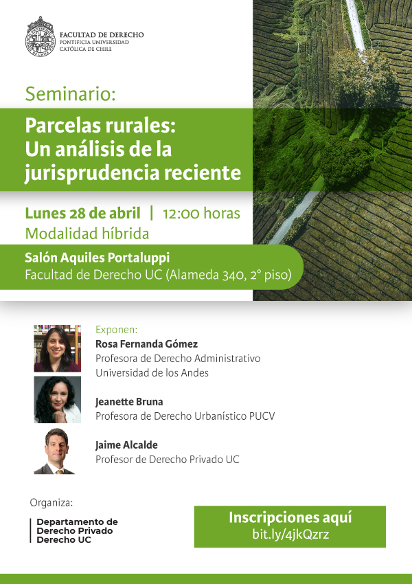 La Facultad de Derecho de la Universidad Católica organiza el Seminario Parcelas rurales: Un análisis de la jurisprudencia reciente, el cual cuenta con la exposición de Rosa Fernanda Gómez, Jeanette Bruma y Jaime Alcalde.