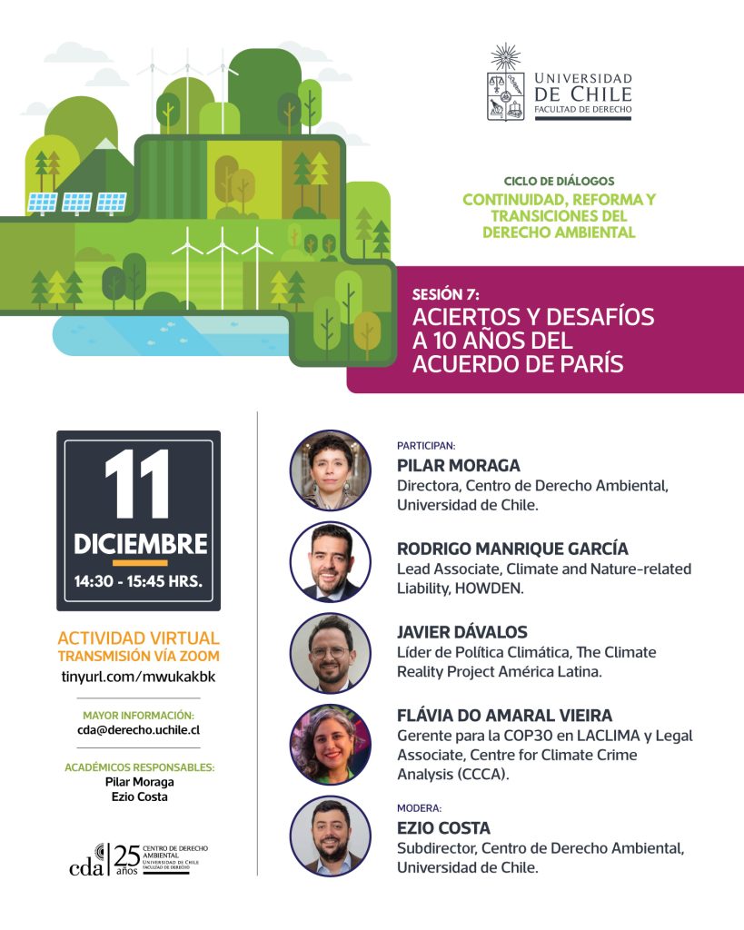 La Facultad de Derecho de la Universidad de Chile, en el marco del Ciclo de diálogos: Continuidad, reforma y transiciones del derecho ambiental, organiza la Sesión 7: “Aciertos y desafíos a 10 años del Acuerdo de París”, en la que participan: