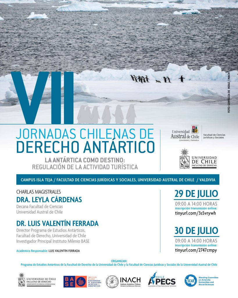 El Programa de Estudios Antárticos de la Facultad de Derecho de la Universidad de Chile y Facultad de Ciencias Jurídicas y Sociales de la Universidad Austral de Chile organizan las VII Jornadas Chilenas de Derecho Antártico “La Antártica como destino: regulación de la actividad turística” que cuentan con las charlas magistrales de la Dra. Leyla Cárdenas, Decana Facultad de Ciencias de la Universidad Austral de Chile y el Dr. Luis Valentín Ferrada Director Programa de Estudios Antárticos, Facultad de Derecho, Universidad de Chile, Investigador Principal Instituto Milenio BASE.