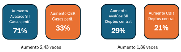 Mientras los valores de venta experimentan un alza promedio del 33% en las comunas periféricas en el período 2717-2025, los departamentos lo hacen en sólo un 21% en el período. Llamemos a este comportamiento la plusvalía de cada tipología por ubicación. Si se compara, por otra parte, el aumento de los avalúos fiscales de las casas en la periferia, en el mismo plazo, tiene una media de 71% (2,14 veces el aumento del valor comercial). Los departamentos de zonas céntricas aumentan su plusvalía en un 21%, y sus avalúos lo hacen en un 29% (con un diferencial de sólo 1,36 veces). Es decir, hay efectivamente una plusvalía mayor en las áreas periféricas, pero esta no se corresponde con el aumento fiscal de los valores de las propiedades.