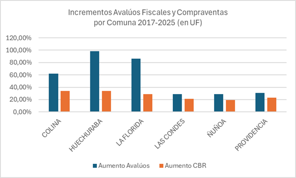 Intentando hacer objetiva esta observación, hemos elaborado un catastro que compara la evolución de compraventas y avalúos fiscales en algunas comunas de Santiago: Colina, Huechuraba y La Florida para la muestra de casas en la periferia y Las Condes, Providencia y Ñuñoa como ejemplos de departamentos en zonas centrales. En éstas se han detectado 246 casos que presentan compraventas entre 2016 y 2017 y que se vuelven a vender entre 2024 y 2025. Luego, esta data se ha comparado con los avalúos fiscales de los mismos bienes en 2017 y 2025. Es decir, puede compararse la evolución de ambos valores en un período relativamente similar. La muestra es ciertamente acotada, pero consideramos que es bastante ilustrativa del fenómeno que queremos explicitar.